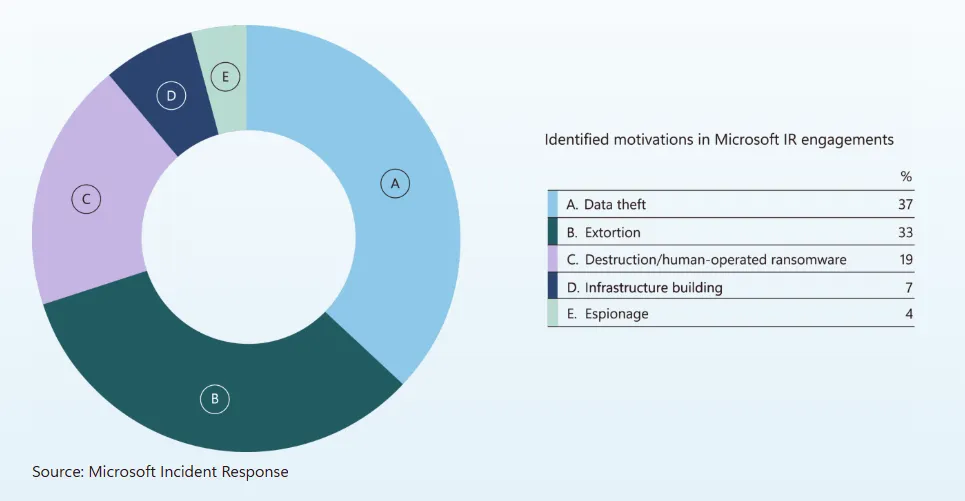 Большинство атак в 2026 году по-прежнему будут иметь финансовую мотивацию. Вымогательство и кража данных остаются основными драйверами киберпреступности. По данным Microsoft, кража данных фигурирует примерно в 37% всех инцидентов.